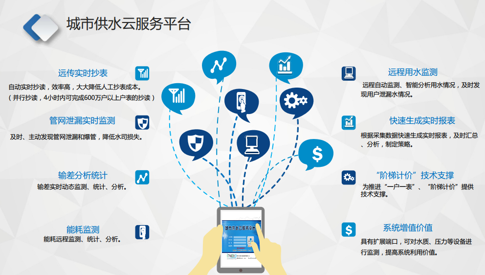 “城市供水云服務平臺”是基于物聯網應用的云服務平臺,是中國唯一針對水務行業提供全面信息化管理的云計算解決方案,本服務平臺綜合應用云計算、大型數據庫、地理