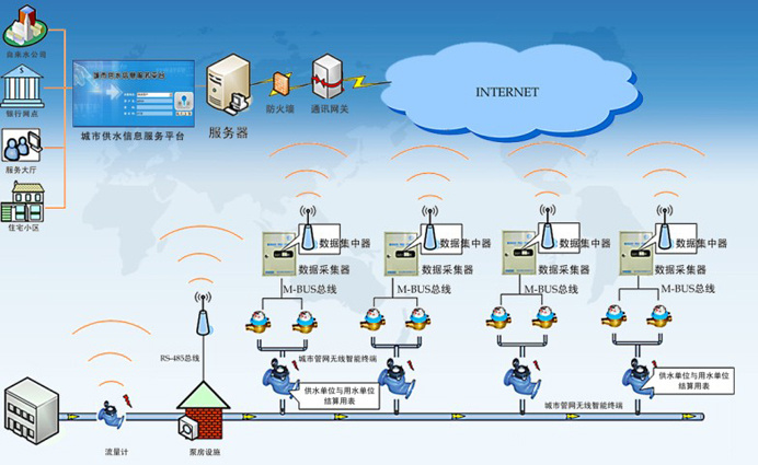 “城市供水云服務平臺”是基于物聯網應用的云服務平臺,是中國唯一針對水務行業提供全面信息化管理的云計算解決方案,本服務平臺綜合應用云計算、大型數據庫、地理信息系統(GIS)、遙測遙控、無線網絡(ADSL/CDMA/GPRS)等技術,以數據平臺為基礎,以網絡平臺為載體,以應用平臺為核心,面向全國各地的供水企業,提供城域化遠程抄表、水務遙測及日常營業管理服務,可對全城的遠傳水表進行實時抄讀,完成水費的自動結算,對全城的供水泵站、供水設施進行實時監控,并在線進行供水管網壓力監測及供水能耗分析,及時發現供水設施故障及管網泄漏。