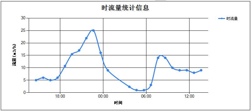 時時動態監測大口徑水表的流量狀況,自動生成大口徑水表的時、日流量曲線,能及時發現其流量異常,以便水司排查,降低損失。(如:在00:00到02:00間流量曲線突然拉高或持續高位,可初步判定有爆管或管網泄漏發生。)