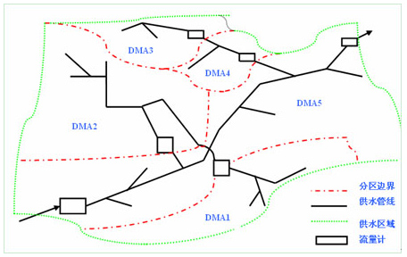 DMA分區(qū)管理是指在供水系統(tǒng)中建一個(gè)個(gè)被切割分離的獨(dú)立區(qū)域,通常采取關(guān)閉閥門(mén)或安裝流量?jī)x表來(lái)形成虛擬或?qū)嶋H獨(dú)立區(qū)域。通過(guò)對(duì)進(jìn)入或流出這一區(qū)域的水量進(jìn)行計(jì)量,并對(duì)流量進(jìn)行分析后來(lái)定量水的泄漏,便于檢漏人員準(zhǔn)確的決定在何時(shí)何處檢漏,并進(jìn)行主動(dòng)的防泄漏控制。
