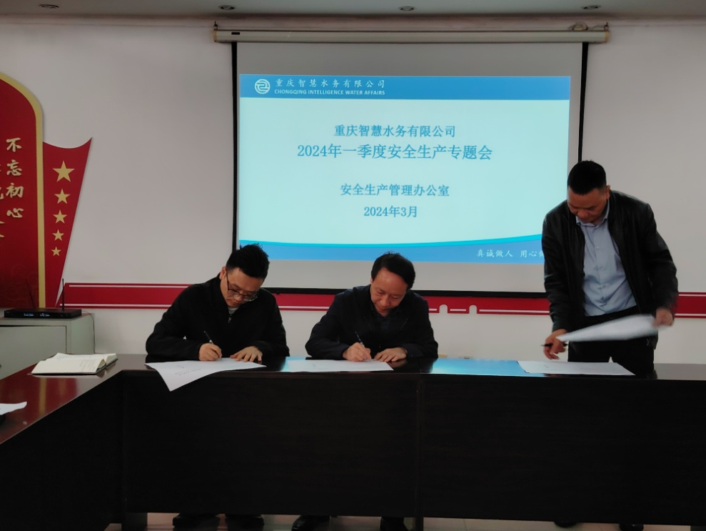 3月29日下午,重慶智慧水務有限公司召開2024年第一季度安全生產專題會議,分解下達公司年度安全目標任務,簽訂安全、消防目標責任書,全面落實安全生產責任。公司安全生產領導小組全體成員、部門負責人、各部門安全員出席會議。